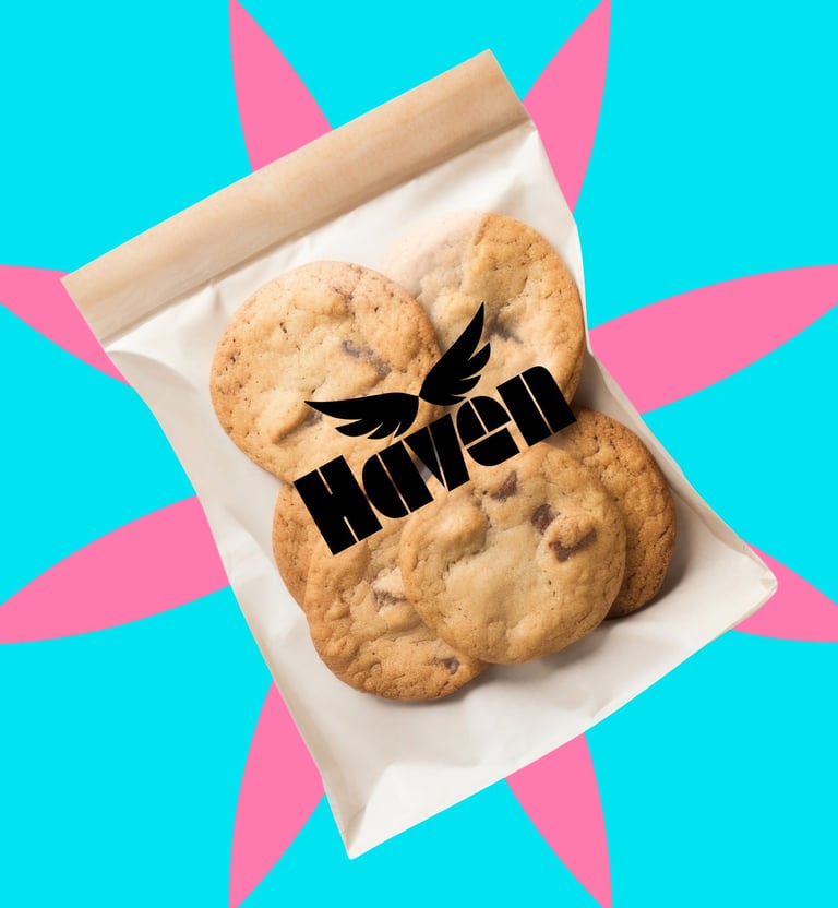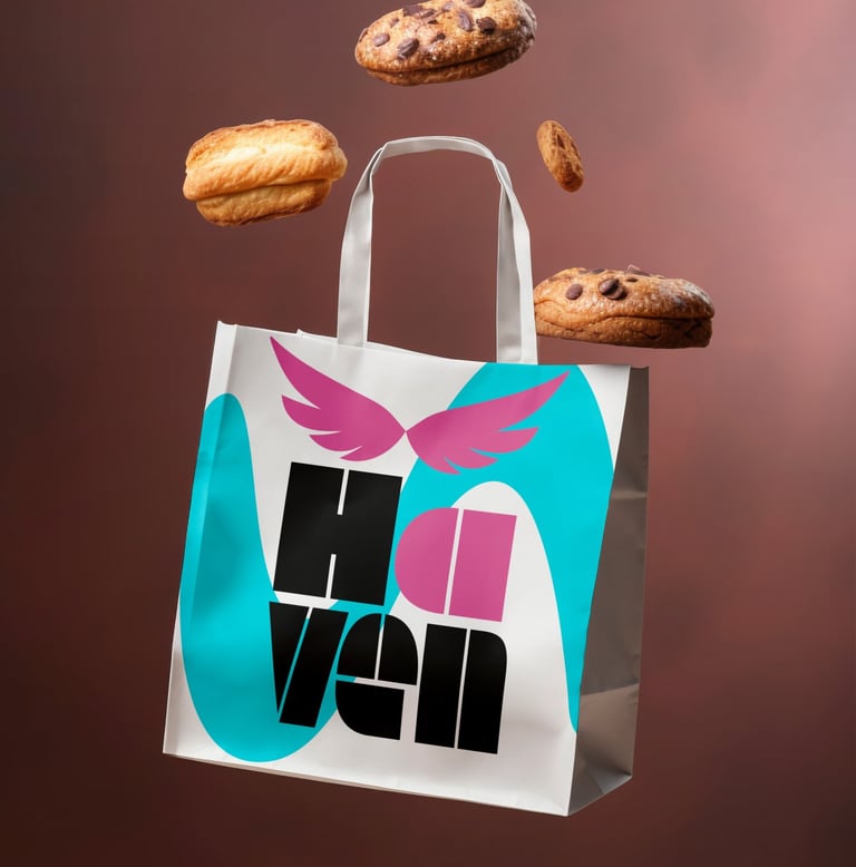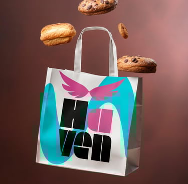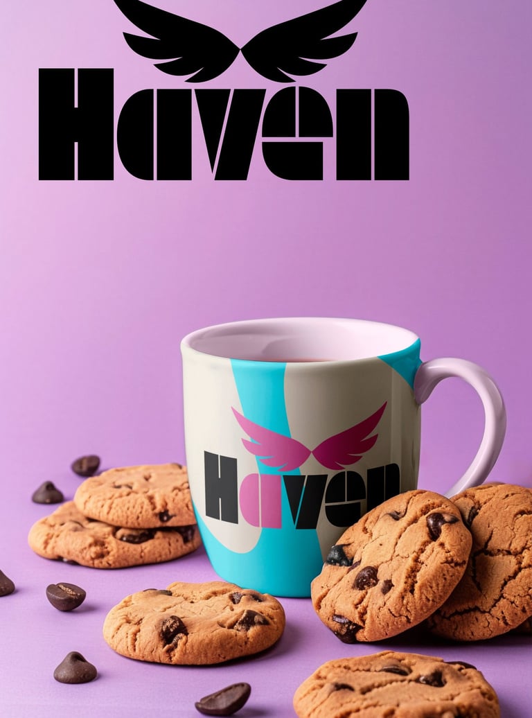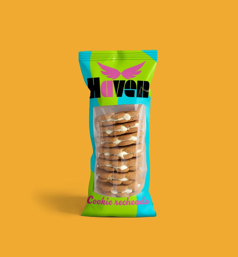 A identidade visual da Haven foi criada a partir de um conceito simples, mas poderoso: o sabor é capaz de te levar ao céu. Essa ideia guiou a escolha do símbolo principal da marca — as asas — representando a leveza e a sensação quase celestial de provar um cookie tão especial.